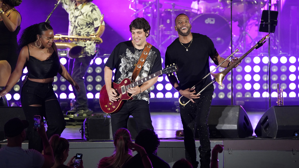 Guitarist Pete Murano center stage with Trombone Shorty photo by Richard Bilow